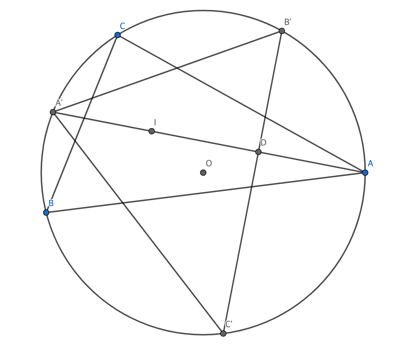 세 점을 $\rm A, B, C$라 하자. 점 $\rm A$를 포함하지 않는 $\overset{\frown}{\rm BC}$의 중점을 $\rm A'$이라 하자. 점 $\rm B', C'$도 마찬가지로 정의하자. 그러면 $\triangle \rm ABC$의 내심과 $\triangle \rm A'B'C'$의 수심은 일치한다.
